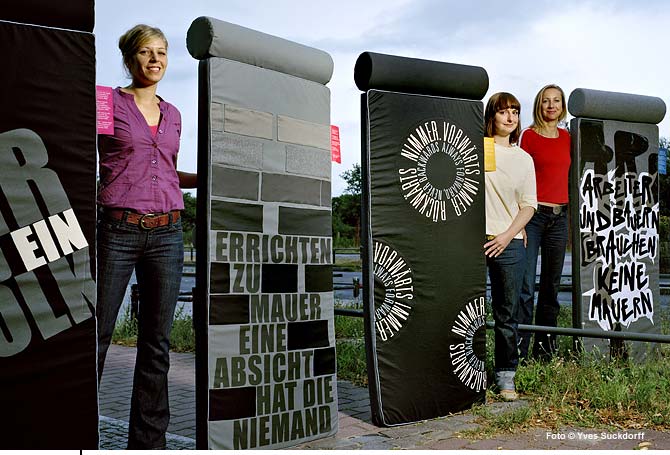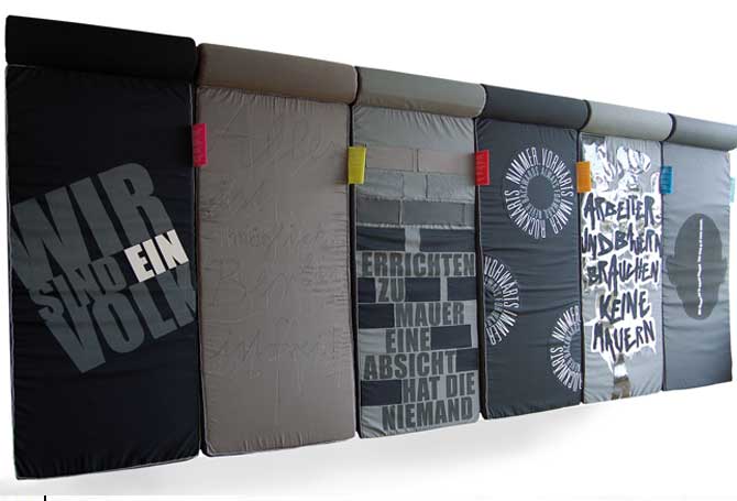 MauermatratzenStoffobjekteIn die Berliner Mauer verwandelte Matratzen mit benähten Bezügen und abnehmbaren KopfrollenDetail Als eines von 20 Projekten waren unsere »Mauermatratzen« und die »Berlin Wall Guestbeds« vom 4. bis 6. Januar 2009 in der Temporären Kunsthalle Berlin im Rahmen der in London während der Design Week bereits erfolgreich gezeigten Ausstellung »20 Jahre Mauerfall – 20 Jahre Freiräume« zu sehen. Dieses Jahr steht das 20-jährige Jubiläum des Falls der Berliner Mauer an. CREATE BERLIN e.V. rief auf zur Auseinandersetzung mit eben diesem Thema, woraufhin wir gemeinsam mit Josephine Rank die Mauermatratzen entwickelten. Sie fungieren hängend als Raumtrenner und werden liegend zu Sitzmöbeln, die Freiraum für Austausch und Begegnung bieten. Die Berlin Wall Guestbeds sind eine Abwandlung der Mauermatratzen. Im September 2009 haben wir die Mauermatratzen verkauft. Seither sind wir nicht mehr für den Inhalt der Seite www.mauermatratzen.de verantwortlich. Unsere ausführliche Projektdokumentation ist unter www.mijulyundca.de/mauermatratzen zu sehen. |       |
