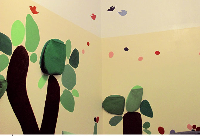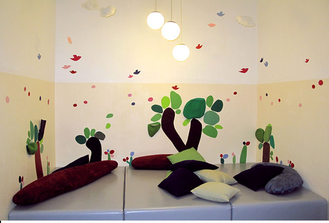 KinderwirtschaftRaumgestaltungHaptische Wand in einem Berliner KindercaféDetail Die Welt entdecken. Formen und Farben sehen, Materialien spüren. Geschichten erfinden. Um all das geht es in dieser Spielecke für Kleinkinder und ihre Eltern im Berliner Café Kinderwirtschaft. Eine freundliche, farbenfrohe, gemütliche Landschaft lädt große und kleine Besucher zu einer Entdeckungsreise mit den Sinnen ein. Verschiedene Materialoberflächen bringen unerwartete haptische Erlebnisse, versteckte Taschen für Spielsachen führen zu überraschenden Entdeckungen. |           |
