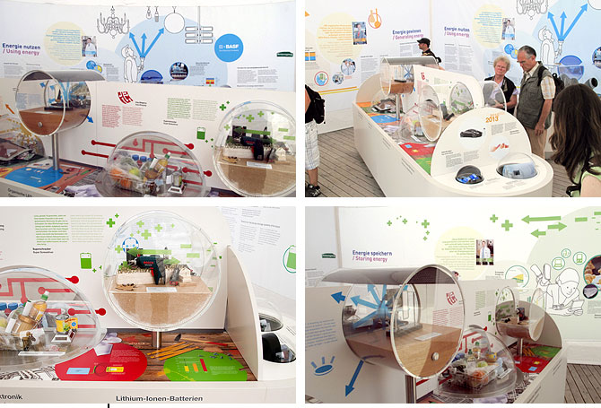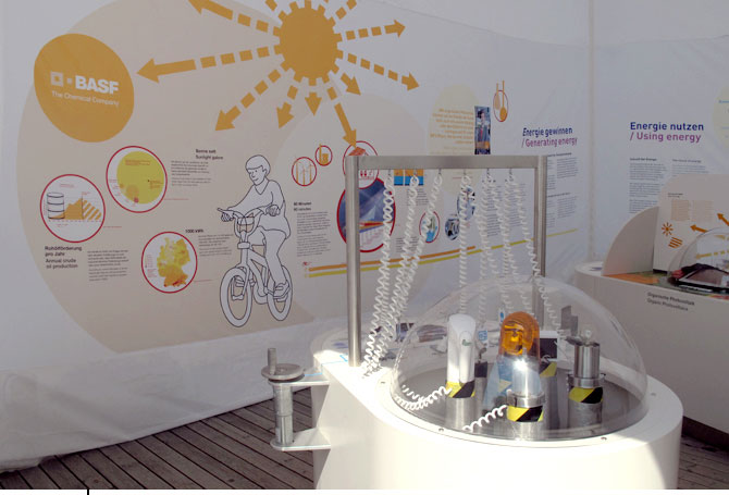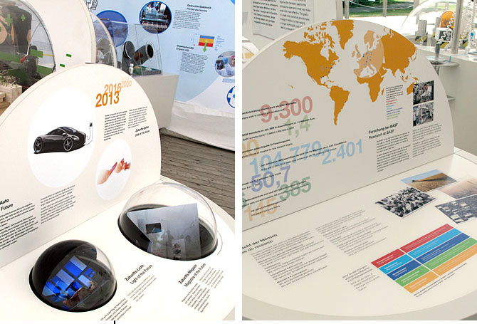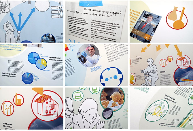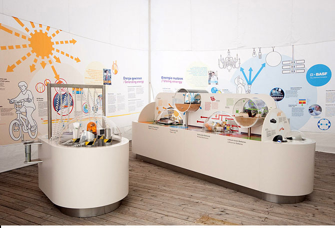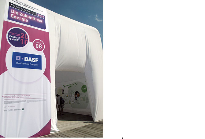 Wie geht Energie?AusstellungsgrafikGrafische Gestaltung eines Ausstellungspavillions für die BASFDetail Visionen sind abstrakt. Forschungsthemen werden oft als Zukunftsmusik unterschätzt. Welche Bedeutung die Forschung aber für ganz konkrete und sehr aktuelle Fragestellungen und Bedürfnisse hat, welche Antworten sie bietet, zeigt diese Ausstellung für des Unternehmens BASF. Im Auftrag und in Zusammenarbeit mit dem Berliner Planungsbüro flying saucer entwickelten wir eine einladende Ausstellungsgrafik mit einer allgemeinverständlichen Bildsprache aus Farben, Illustrationen und Infografiken. Die Ausstellung war zunächst im Rahmen der Ausstellung »ENTDECKUNGEN 2010: Energie« vom 20. Mai bis 29. August 2010 auf der Insel Mainau und später auch in München und am Potsdamer Platz in Berlin zu sehen. (Bild 01 © flying saucer) |           |