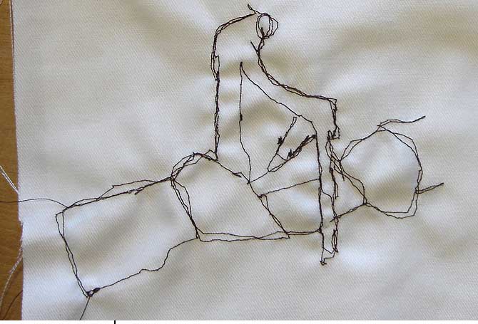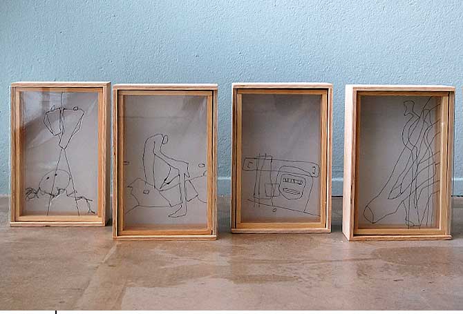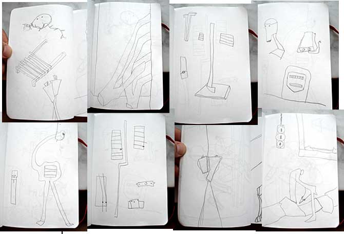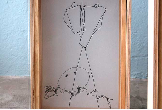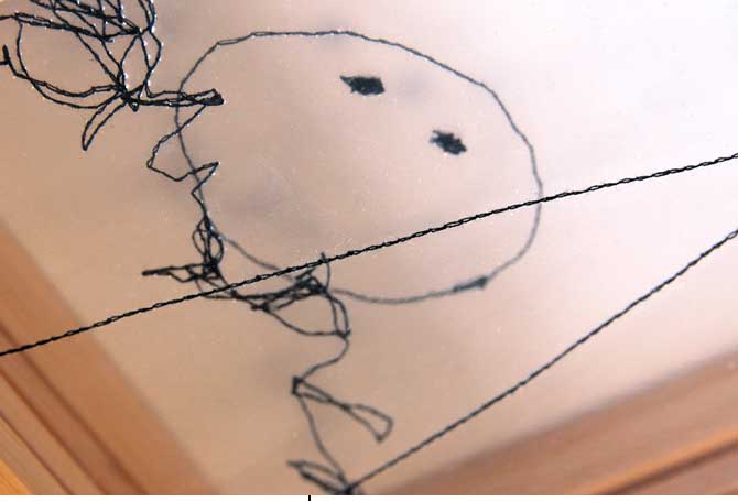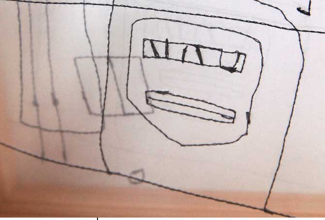 NähkästenMaterialbilderAuf transparente Folie genähte Skizzen, in mehreren Schichten in Holzkästen übereinander gereihtDetail Der Geist eines Ortes und die Geister eines Ortes sind Gegenstand kleiner, schnell-gemachter Illustrationen, die meine Skizzenbücher füllen. Um diesen Skizzen einen Teil ihrer ursprünglichen Räumlichkeit zurück zu geben bzw. ihnen eine neue, eigene Tiefe zu verleihen, habe ich das Format der Nähkästen entwickelt. Auf analoge Weise werden Teile der Skizzen auf verschiedene transparente Layer verteilt, die dann in einem Holzrahmen hintereinander montiert werden. Aus verschiedenen Blickwinkeln betrachtet, lassen sich so darin ganz unterschiedliche Bilder finden. (jz) |           |