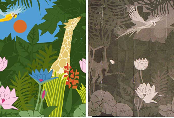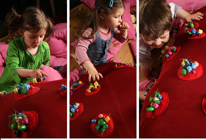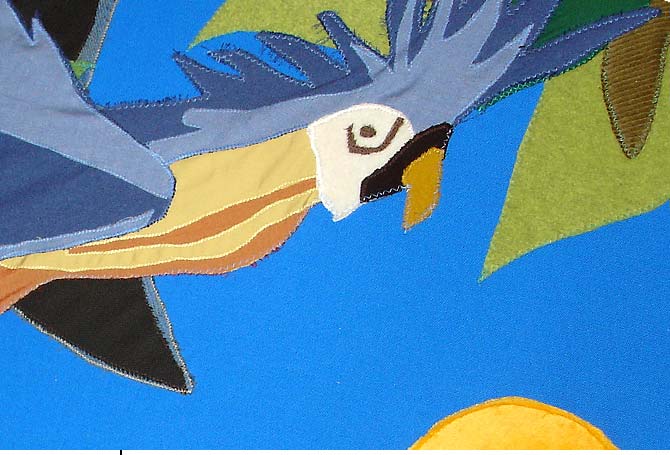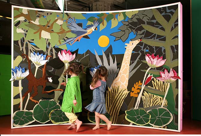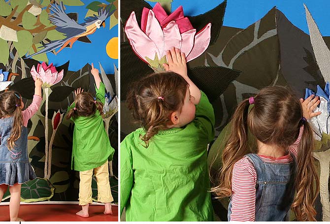 ParadiesbildStoffbild2 × 3 m großes Stoffbild im Auftrag des MACHmit! Museum BerlinDetail Kindern die verschiedenen Vorstellungen vom Paradies zu vermitteln war das Ziel einer Ausstellung im MACHmit! Museum in Berlin. In diesem Zusammenhang bekamen wir im Herbst 2004 den Auftrag zur Realisierung eines Exponats. Angeregt durch die Gemälde Henri Rousseaus entstand ein 2 × 3 m großes interaktives Wandbild aus Stoff. Die verarbeiteten Stoffe haben wir bewusst so gewählt, dass das Motiv Volumen bekam und einzelne Objekte (z.B. Blüten) mit unterschiedlicher Haptik für das junge Publikum begreifbar wurden. Das Bild war Teil der Ausstellung »Auf der Suche nach dem Paradies« und wurde von November 2004 bis Juli 2005 im MACHmit! Museum gezeigt. |           |