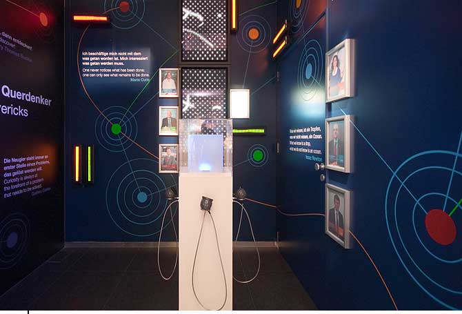 Raum der IdeenAusstellungsgrafikGrafische Gestaltung des »Raums der Ideen« im Besucherzentrum der BASF in LudwigshafenDetail Im »Raum der Ideen« im Besucherzentrum der BASF soll der Besucher sich mit dem magischen Moment beschäftigen, in dem eine Idee entsteht. Um wissenschaftliche Fragen zu stellen oder Thesen zu formulieren, braucht der Forscher Neugierde, Wachsamkeit und Wissen. Diesen abstrakten und persönlichen Moment zu visualisieren und erlebbar zu machen, war die Aufgabe, als wir im Auftrag und in Zusammenarbeit mit dem verantwortlichen Planungsbüro flying saucer die Grafik für den 3 × 3 m großen Raum entwarfen. Im Hintergrund ist das unendliche Netz des Wissens angedeutet und darauf werden auf drei verschiedenen Ebenen konkrete Inhalte nach vorne geholt: 1. Zitate interessanter Forscher aus allen wissenschaftlichen Bereichen, 2. Statements zur Motivation von BASF-Forschern als Audioinstallation und 3. Begriffe zu den so genannten Megatrends auf LED-Laufschriften. (alle Bilder © flying saucer) |           |