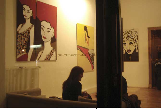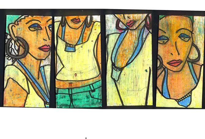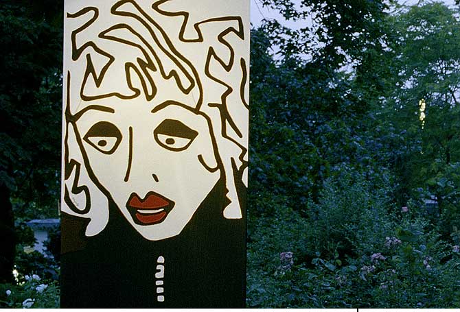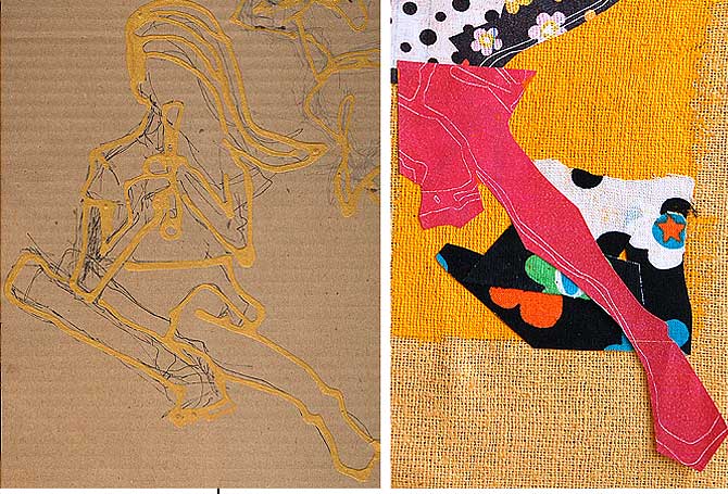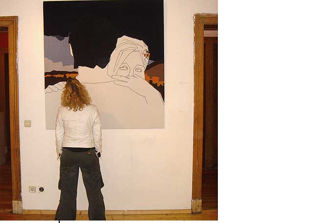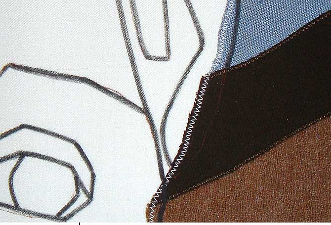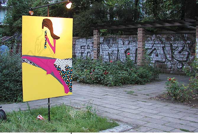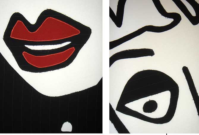 LadiesStoffbilderIn freier Arbeit entstandene großformatige Bilder aus StoffDetail Im Frühjahr und Sommer 2004 entstand in freier Arbeit eine Gruppe von Stoffbildern mit Portraits von Frauen. Die Arbeiten wurden unter dem Titel »Ladies by mijuly« mehrfach ausgestellt (17. – 18.07.2004 p:os, Hamm; 05. – 08.08.2004 Rosengarten, Berlin; 18. – 28.09.2004 filesharing | showroom, Berlin) und publiziert (»Wonderland«, Die Gestalten Verlag, Berlin 2004). |           |