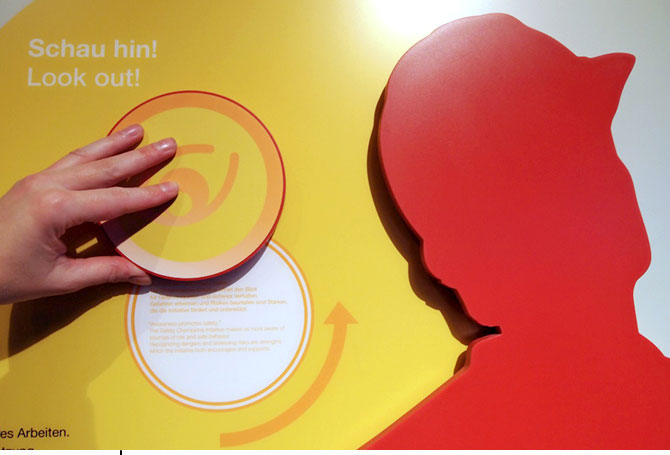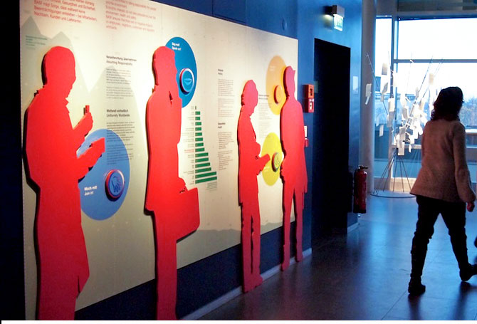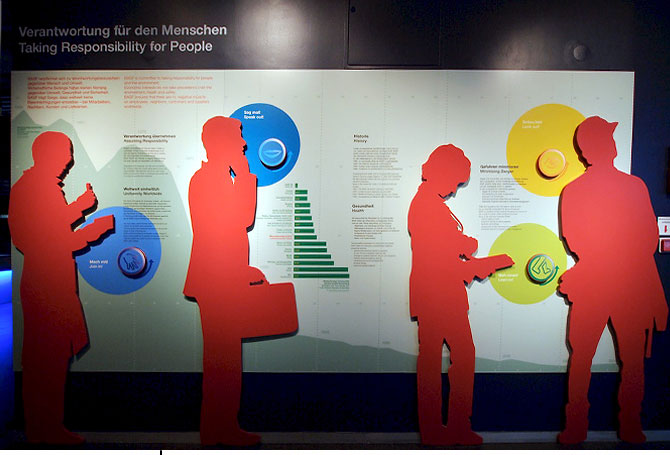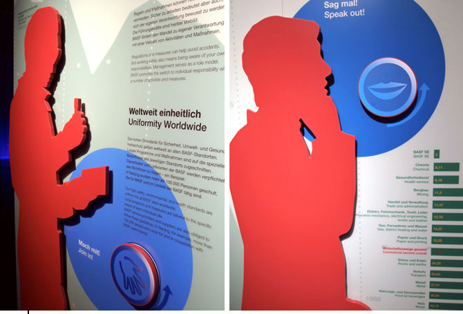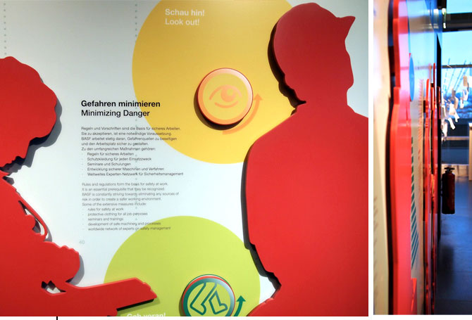Wand der VerantwortungAusstellungsgrafikGrafische Gestaltung einer Wandfläche im Besucherzentrum der BASF in LudwigshafenDetail In einem Unternehmen mit vielen tausend Mitarbeitern in aller Welt kommen Fragen von Sicherheit, Gesundheit und verantwortungsvollem Handeln eine große Bedeutung bei. In diesem Ausstellungsbereich des BASF Besucherzentrums in Ludwigshafen wird deutlich, in wie weit die Entwicklung über die Jahre positiv ist, wie wichtig es gleichzeitig bleibt, immer weiter aktiv an diesen Fragen zu arbeiten und was der einzelne, das Team oder das ganze Unternehmen dafür tun können. Die Umsetzung erfolgte durch Infografiken und lebensgroße Silhouetten, die die verschiedenen Tätigkeitsfelder symbolisieren. Sie entstand im Auftrag und in Zusammenarbeit mit dem Planungsbüro flying saucer. (alle Bilder © flying saucer) |           |