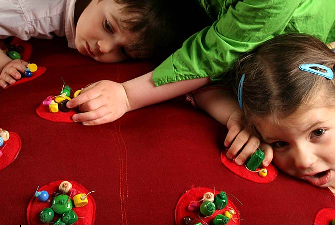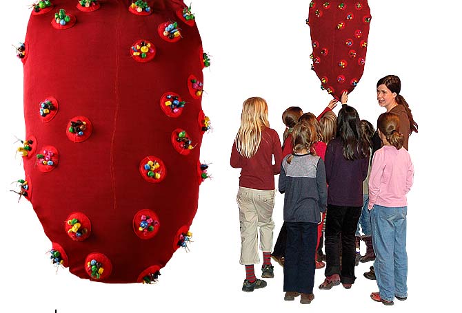 Textile ZungeStoffobjektÜberdimensionale Zunge aus Stoff mit aufgenähten Geschmacksknospen zum Bestaunen und AnfassenDetail Kindern nicht nur die süßen Seiten, sondern ein umfassendes Bild von Schokolade zu vermitteln, ist das Ziel der Ausstellung »Schokolade« im Berliner MACHmit! Museum. Um die Verteilung der Geschmacksknospen auf der menschlichen Zunge zu demonstrieren, entwickelten wir eine überdimensionale Zunge aus Stoff. Nach dem aktuellen Stand der Wissenschaft verteilen sich die verschiedenen Geschmacksrezeptoren zu annähernd gleichen Teilen auf der gesamten Zunge, so dass wir eine Reihe bunter Inseln aus Perlen entwickelten, die die verschiedenen Geschmacksrichtungen salzig, süß, sauer, bitter und umami demonstrieren. Die Zunge ist außerdem so hergestellt, dass die kleinen und neugierigen Besucher sie auch anfassen können. Die Ausstellung zeigt darüber hinaus das Paradiesbild, ein weiteres textiles Exponat von uns. |           |